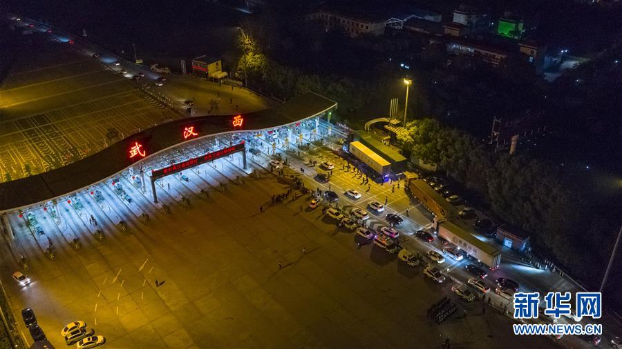 4月8日凌晨,車輛通過武漢西高速收費(fèi)站(無人機(jī)拍攝)。 新華社記者 沈伯韓 攝
