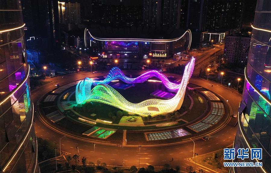 4月7日,武漢光谷環(huán)島開啟燈光秀(無人機(jī)照片)。當(dāng)日,隨著武漢解除離漢通道管控進(jìn)入倒計(jì)時(shí),全市開啟了城市景觀照明,夜色中的武漢美不勝收。新華社記者李賀攝