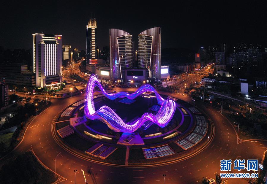 4月7日,武漢光谷環(huán)島開啟燈光秀(無人機照片)。新華社記者李賀攝
