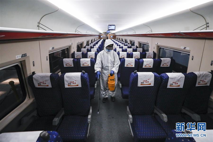 4月7日,武漢動車段運用車間工作人員周明輝在給列車消毒。 新華社記者 沈伯韓 攝