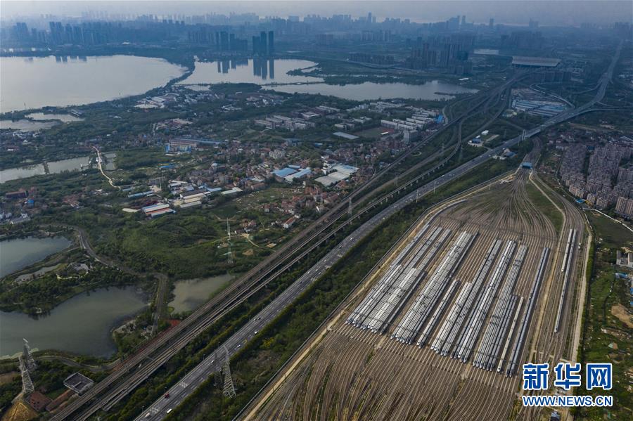 4月7日,在武漢動(dòng)車段,列車??吭诖孳嚲€上(無(wú)人機(jī)照片)。新華社記者 沈伯韓 攝
