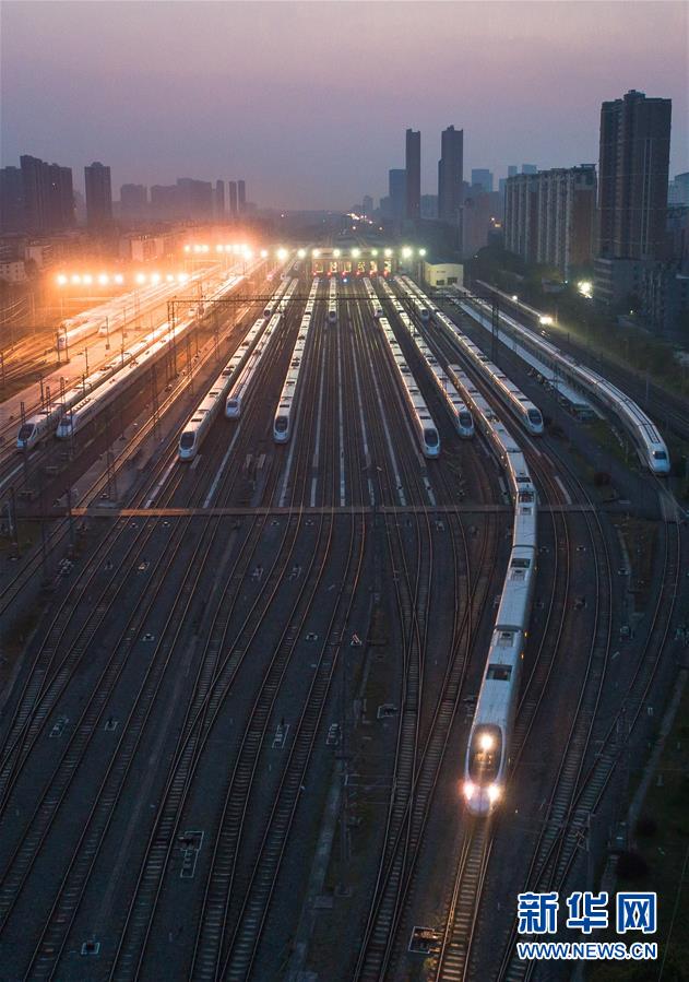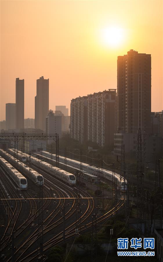 4月8日,在武漢動(dòng)車段,列車停靠在存車線上準(zhǔn)備投入運(yùn)行。 新華社記者 肖藝九 攝