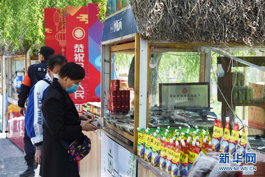 4月13日,游客在濟(jì)南百花洲歷史文化街區(qū)購(gòu)買(mǎi)文創(chuàng)產(chǎn)品。新華社記者王凱攝
