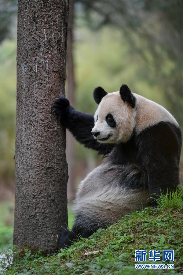 4月14日,大熊貓“喜妹”在中國大熊貓保護(hù)研究中心核桃坪基地活動(dòng)場內(nèi)。新華社記者張超群攝