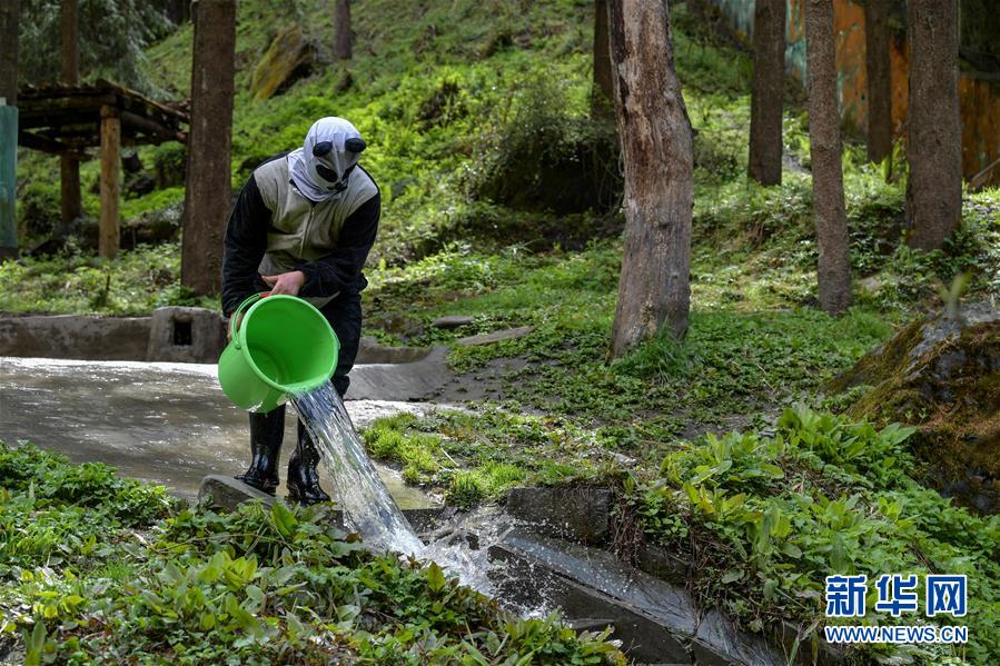 4月14日,中國大熊貓保護(hù)研究中心核桃坪基地的飼養(yǎng)員周季秋身著涂抹了稀釋后大熊貓尿液的“熊貓偽裝服”,在大熊貓活動(dòng)場(chǎng)內(nèi)打掃衛(wèi)生。新華社記者張超群攝