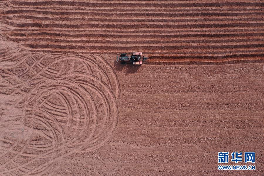 4月15日,農(nóng)民操作機(jī)械在杭錦旗道勞呼都格嘎查的農(nóng)田里翻地,為種植紅蔥做準(zhǔn)備(無人機(jī)照片)。春種時節(jié),在內(nèi)蒙古鄂爾多斯市杭錦旗道勞呼都格嘎查,農(nóng)民忙著播種紅蔥。在鄂爾多斯高原種植的紅蔥耐旱耐寒,具有較好的經(jīng)濟(jì)效益。新華社記者徐欽攝