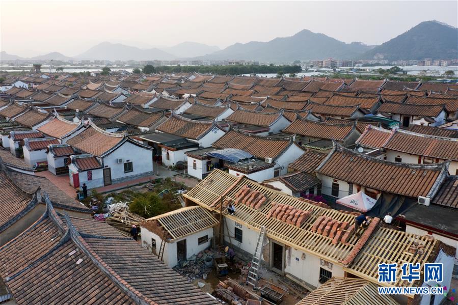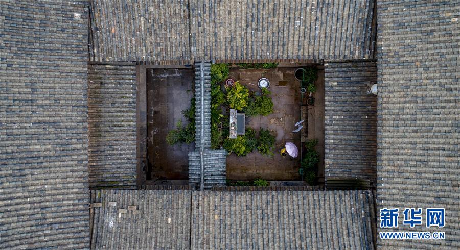 11月14日,埭美村村民在修繕一座古民居(無人機拍攝)。新華社記者姜克紅攝