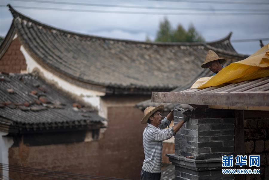 在石屏縣異龍鎮(zhèn)符家營村211號民居,工人王艷華在修繕屋頂(8月8日攝)。新華社記者江文耀攝