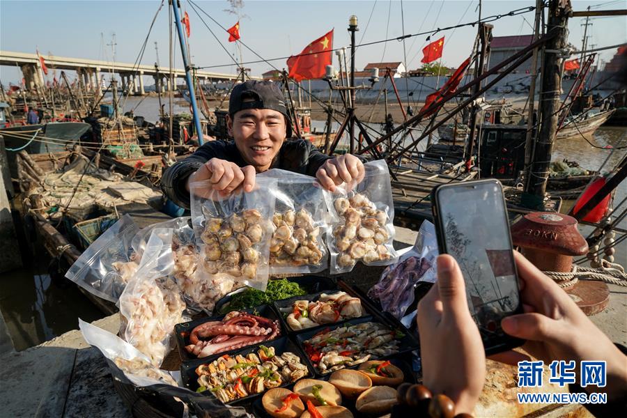 4月22日,31歲的顧峻豪(左)在朱蓬口漁港拍攝短視頻推銷海產品。他從去年9月起開始做網絡主播銷售海產品,目前已有12萬粉絲。新華社記者楊磊攝
