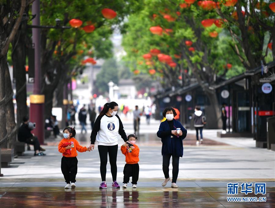 4月23日,游客在西安大唐不夜城步行街游覽。 新華社記者 張博文 攝