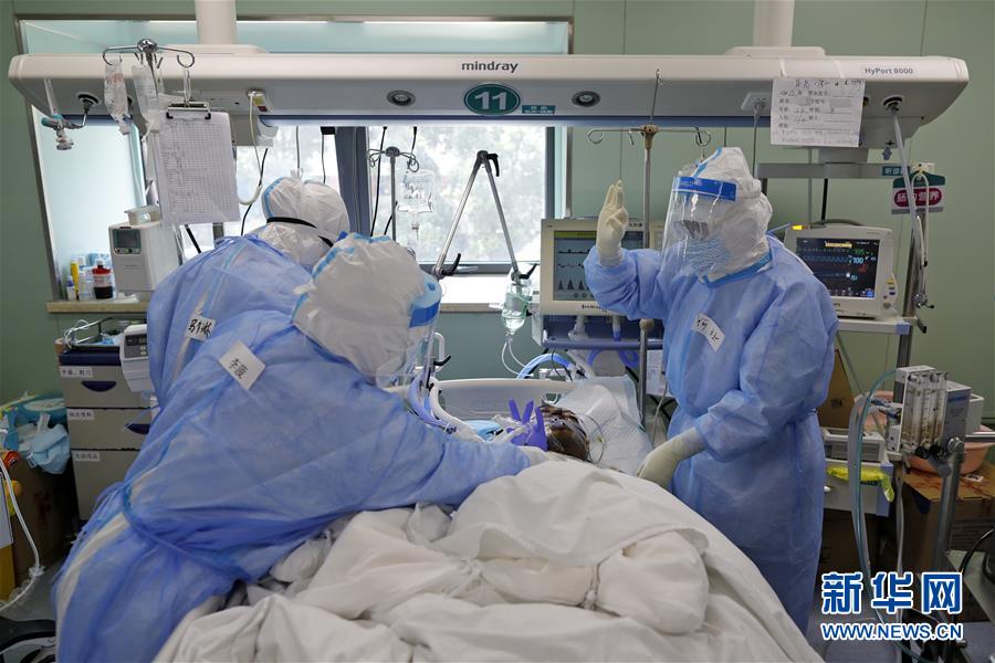 4月24日,在位于武漢的華中科技大學(xué)同濟醫(yī)學(xué)院附屬協(xié)和醫(yī)院西院,醫(yī)務(wù)人員馬夢琳、李菠、何玨(從左至右)在護理核酸檢測結(jié)果轉(zhuǎn)陰的新冠肺炎病人。新華社記者沈伯韓攝