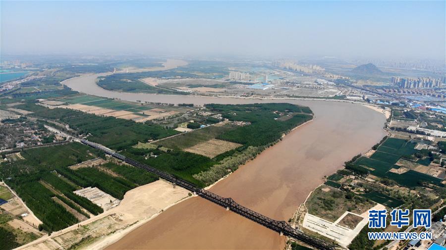 4月24日在山東濟(jì)南拍攝的黃河景色(無(wú)人機(jī)照片)。春暖花開的時(shí)節(jié),濟(jì)南黃河兩岸春風(fēng)送綠,大河、綠植與城市構(gòu)成了一幅春的畫卷。新華社記者王凱攝