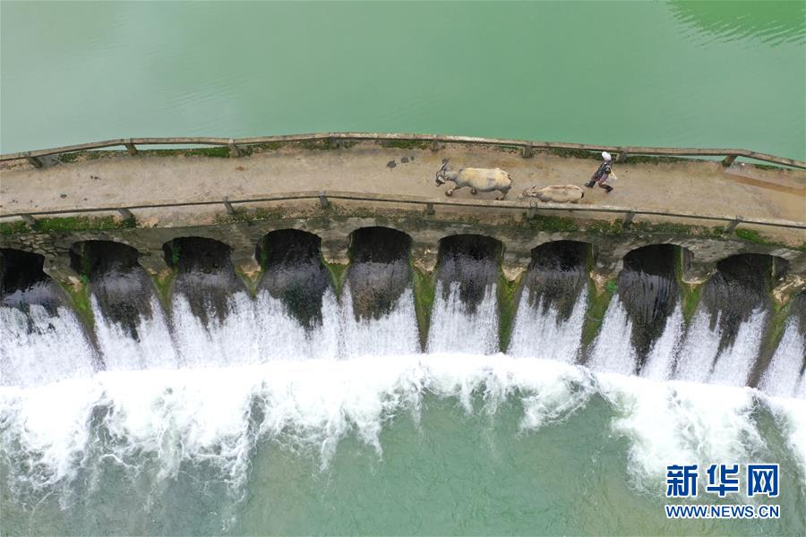 4月23日,在廣西隆安縣南圩鎮(zhèn),農(nóng)人趕著牲畜走過(guò)一座小橋(無(wú)人機(jī)照片)。新華社記者周華攝