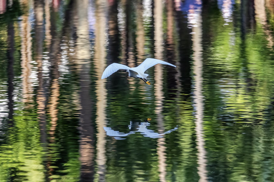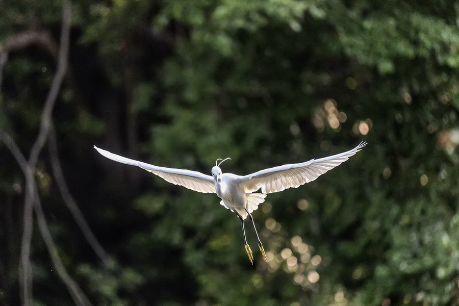 4月15日,攝于南山區(qū)華僑城天鵝堡附近。這是深圳拍鷺鳥(niǎo)的其中一個(gè)好去處。白鷺飛行時(shí)頭往回縮至肩背處,頸向下曲成袋狀,兩腳向后伸直,遠(yuǎn)遠(yuǎn)突出于尾后,兩翅緩慢地鼓動(dòng)飛翔。徐捷攝