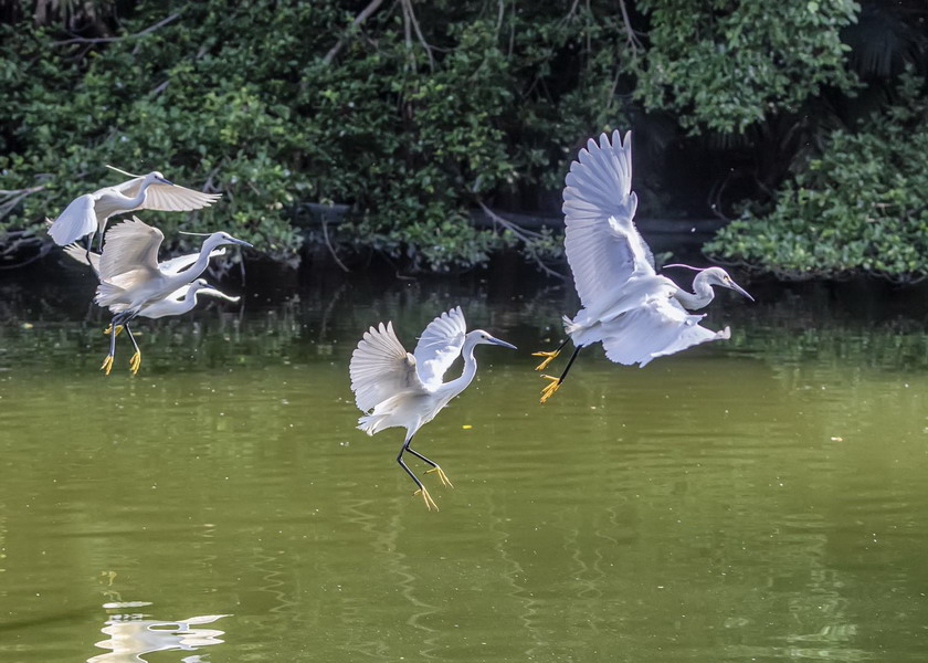 4月15日,攝于南山區(qū)華僑城天鵝堡附近。這是深圳拍鷺鳥(niǎo)的其中一個(gè)好去處。四只白鷺在水面上爭(zhēng)相捕食。徐捷攝