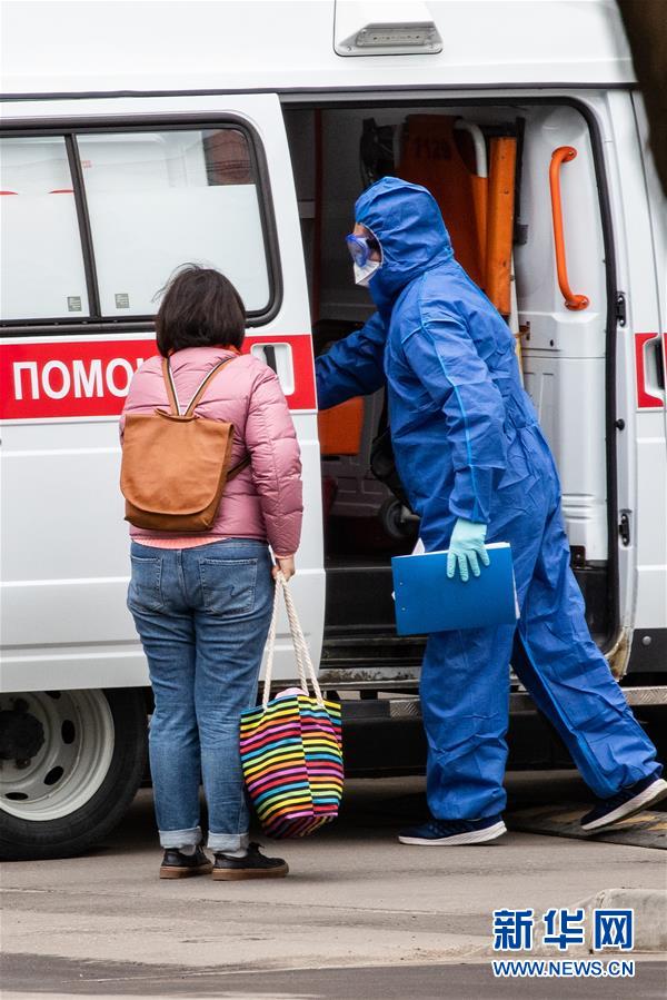 4月27日,在俄羅斯首都莫斯科,醫(yī)護人員(右)引導(dǎo)一名女子走上救護車。據(jù)俄羅斯防疫指揮部27日消息,過去24小時俄新增新冠肺炎確診病例6198例,累計確診87147例,單日增幅7.66%。新華社記者白雪騏攝