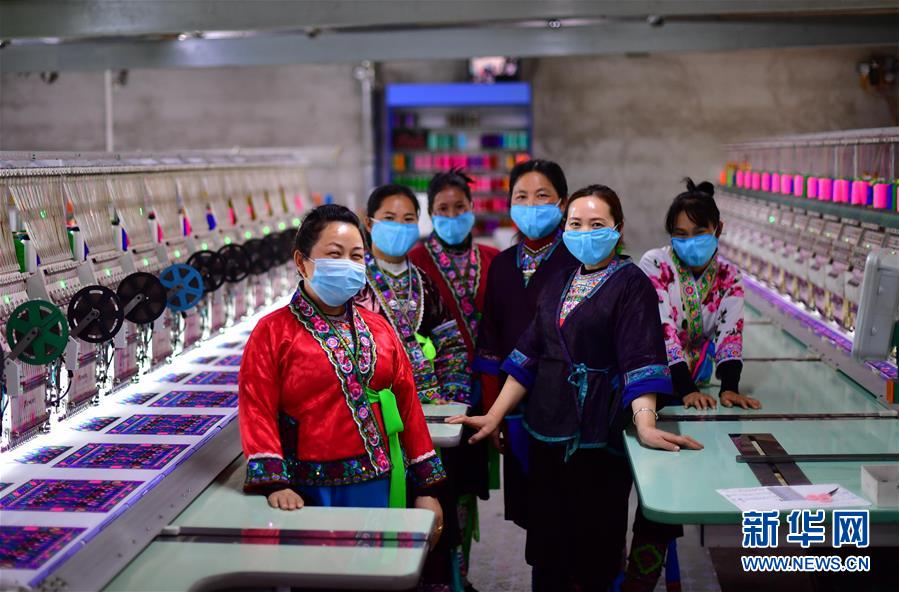 在廣西融水苗族自治縣錦繡苗山刺繡有限公司,44歲的何慧瓊(左一)和員工們在車間里合影(3月13日攝)。