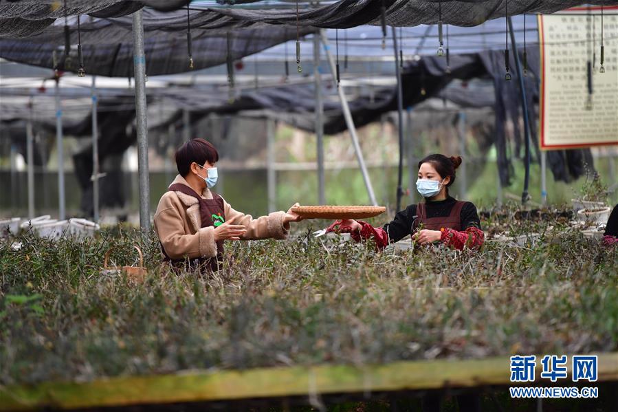 在廣西融水苗族自治縣七彩農場,梁壬梅(左)和脫貧戶何春瓊在采收石斛(3月13日攝)。