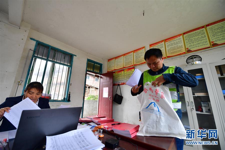 李義成(右)在辦公室拿上扶貧材料,準備走訪貧困戶(4月20日攝)。新華社記者黃孝邦攝