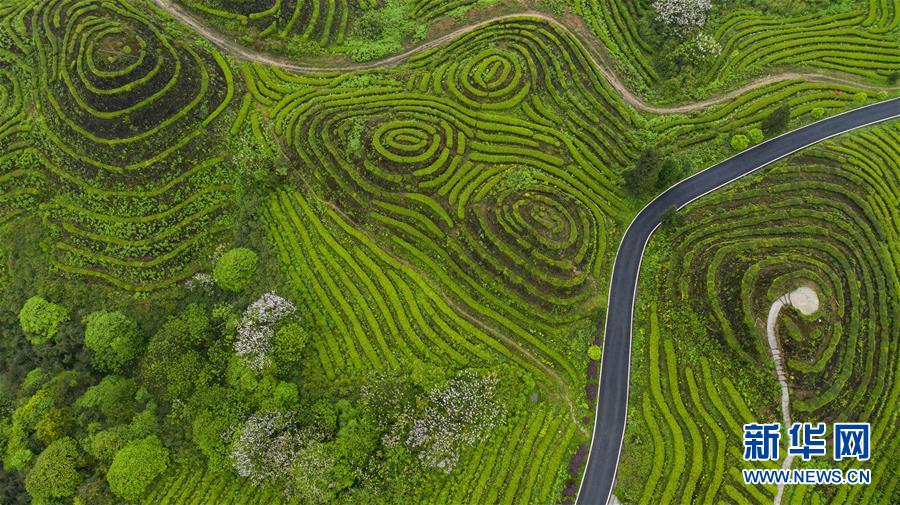 俯瞰鹿鳴茶海一角(4月28日無人機照片)。四川省珙縣的鹿鳴茶海,常年云霧繚繞,茶壟依山分布,美不勝收。新華社記者江宏景攝