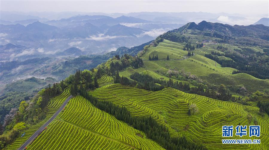 俯瞰鹿鳴茶海一角(4月28日無人機照片)。四川省珙縣的鹿鳴茶海,常年云霧繚繞,茶壟依山分布,美不勝收。新華社記者江宏景攝