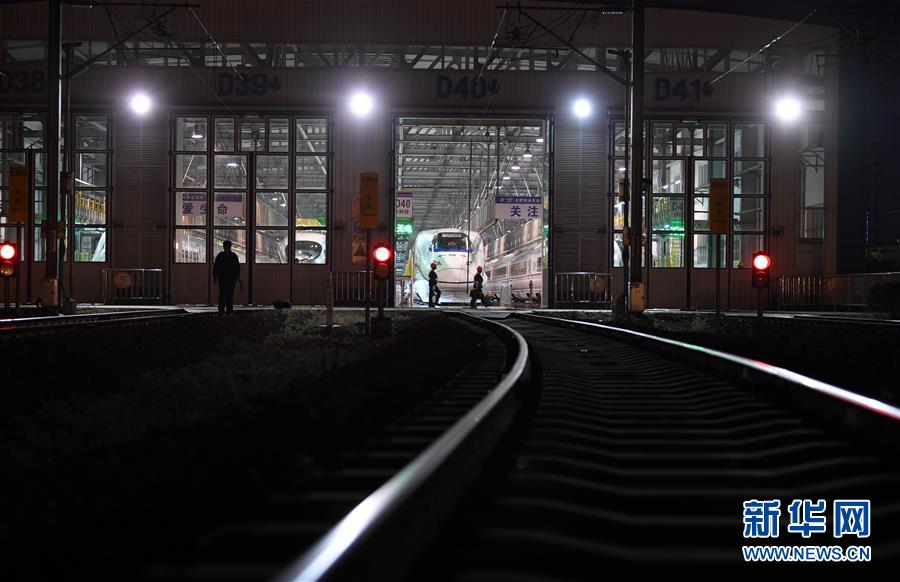4月29日夜,工作人員行走在合肥南動(dòng)車運(yùn)用所檢修車間內(nèi)。每當(dāng)夜深人靜的時(shí)候,合肥南動(dòng)車運(yùn)用所卻燈火通明,“動(dòng)車安全守護(hù)者”們堅(jiān)守崗位,對(duì)動(dòng)車組進(jìn)行全面細(xì)致檢修。新華社記者 劉軍喜 攝