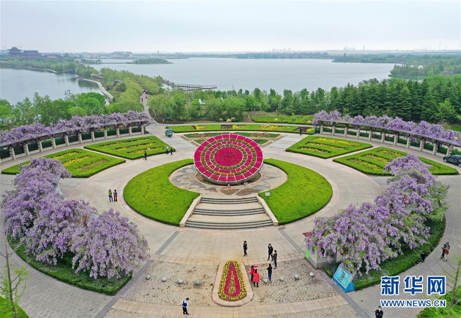 5月2日,游人在位于山東青島膠州市的青島大沽河省級(jí)生態(tài)旅游度假區(qū)賞花游玩(無人機(jī)照片)?!拔逡弧奔偃掌陂g,人們以多種方式放松心情、享受假日。新華社發(fā)(王昭脈攝)