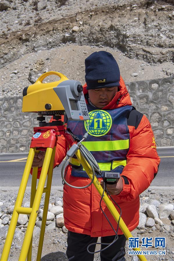 國測一大隊隊員金良在操作水準儀(4月18日攝)。水準測量是一種利用提供水平視線的儀器(如水準儀、水準標(biāo)尺),測定地面不同點之間的高差,并以此推算高度的一種方法,是經(jīng)典大地測量的重要技術(shù)之一。在目前正在進行的2020珠峰高程測量中,部分國測一大隊隊員承擔(dān)了水準測量的任務(wù)。新華社記者晉美多吉攝