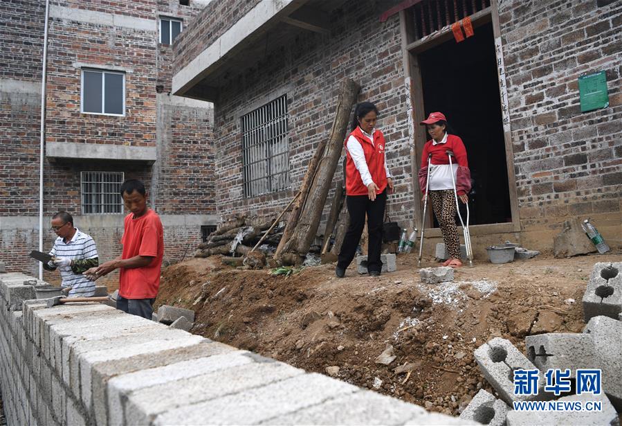 唐莉(右二)在平樂縣張家鎮(zhèn)老埠村貧困戶陶仁桂家查看無障礙設施改造項目建設進展(5月4日攝)。新華社記者周華攝
