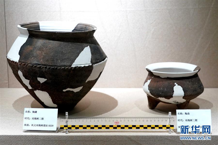 這是雙槐樹(shù)遺址出土的陶罐(左)、陶鼎(2019年8月27日攝)。新華社記者李安攝