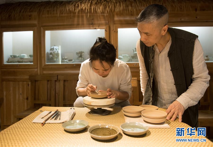 5月8日,“90后”瓷人湯佳(左)在龍泉青瓷裝飾紋樣研究所對著項宏金收藏的古瓷器刻劃魚紋盤。1965年出生的項宏金,被浙江龍泉年輕一代瓷人稱為“項哥”,他從20世紀(jì)90年代開始收集龍泉青瓷標(biāo)本,研究青瓷紋樣。2014年出版著作《龍泉青瓷裝飾紋樣》,次年開設(shè)龍泉青瓷裝飾紋樣研究所,將自己收藏的千余件標(biāo)本跟瓷器愛好者、創(chuàng)作者免費(fèi)分享。新華社記者翁忻旸攝