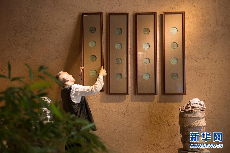 5月7日,項宏金在龍泉青瓷裝飾紋樣研究所懸掛用古青瓷標(biāo)本制作的掛框。1965年出生的項宏金,被浙江龍泉年輕一代瓷人稱為“項哥”,他從20世紀(jì)90年代開始收集龍泉青瓷標(biāo)本,研究青瓷紋樣。2014年出版著作《龍泉青瓷裝飾紋樣》,次年開設(shè)龍泉青瓷裝飾紋樣研究所,將自己收藏的千余件標(biāo)本跟瓷器愛好者、創(chuàng)作者免費(fèi)分享。新華社記者翁忻旸攝