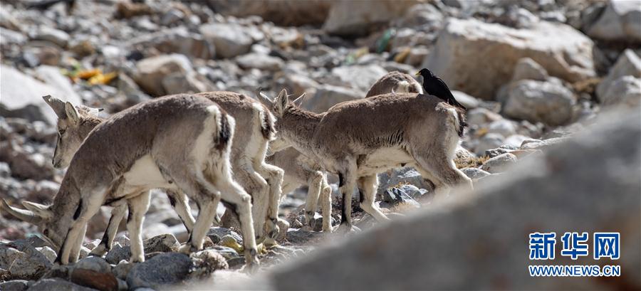 黃嘴山鴉停留在巖羊身上(5月8日攝)。當(dāng)日,一群巖羊在珠峰大本營(yíng)周?chē)捠?,黃嘴山鴉飛到巖羊身上停留,構(gòu)成一幅幅生動(dòng)有趣的雪域圖畫(huà)。新華社記者晉美多吉攝