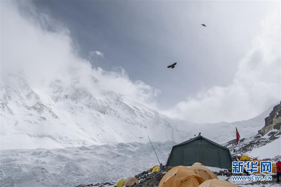 在海拔6500米的珠峰前進(jìn)營地,幾只黃嘴山鴉在空中飛翔(5月10日攝)。新華社記者孫非攝