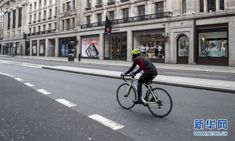 5月12日,在英國倫敦,一名男子騎行經(jīng)過攝政街關閉的店鋪。新華社記者韓巖攝