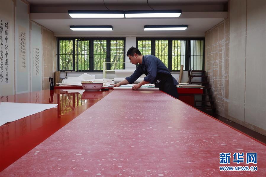 5月13日,古籍修復(fù)師在對(duì)書畫作品進(jìn)行裝裱操作。天一閣藏品修復(fù)部目前有修復(fù)師14人,每年約修復(fù)古籍14000余頁。據(jù)介紹,修復(fù)一冊古籍通常需要1至2個(gè)月,有的甚至需要1年以上。新華社記者鄭夢雨攝