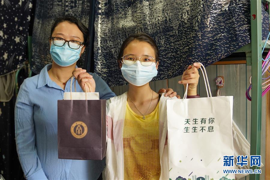5月15日,在西南大學女生宿舍內(nèi),一名學生(右)展示學校和學院送來的裝有口罩、防疫指南的紙袋。當日,重慶西南大學迎來疫情以來首批返校大學生。據(jù)介紹,按照疫情防控的需要,重慶市高校2020年春季學期從5月11日起按照“一校一策”原則,實行錯峰錯時分批次有序開學復(fù)課。新華社記者劉潺攝