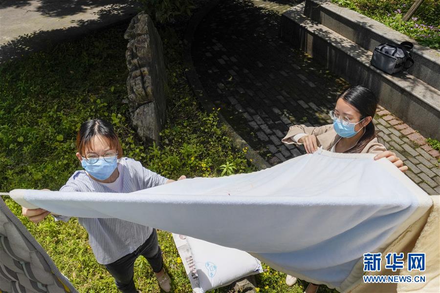 5月15日,在西南大學一棟宿舍樓下,一名返校大學生(左)在輔導(dǎo)員老師的幫助下曬被子。當日,重慶西南大學迎來疫情以來首批返校大學生。據(jù)介紹,按照疫情防控的需要,重慶市高校2020年春季學期從5月11日起按照“一校一策”原則,實行錯峰錯時分批次有序開學復(fù)課。新華社記者劉潺攝