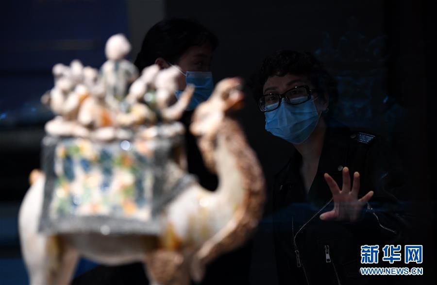 游客在陜西歷史博物館參觀唐三彩駱駝載樂俑(3月25日攝)。新華社記者 李一博 攝