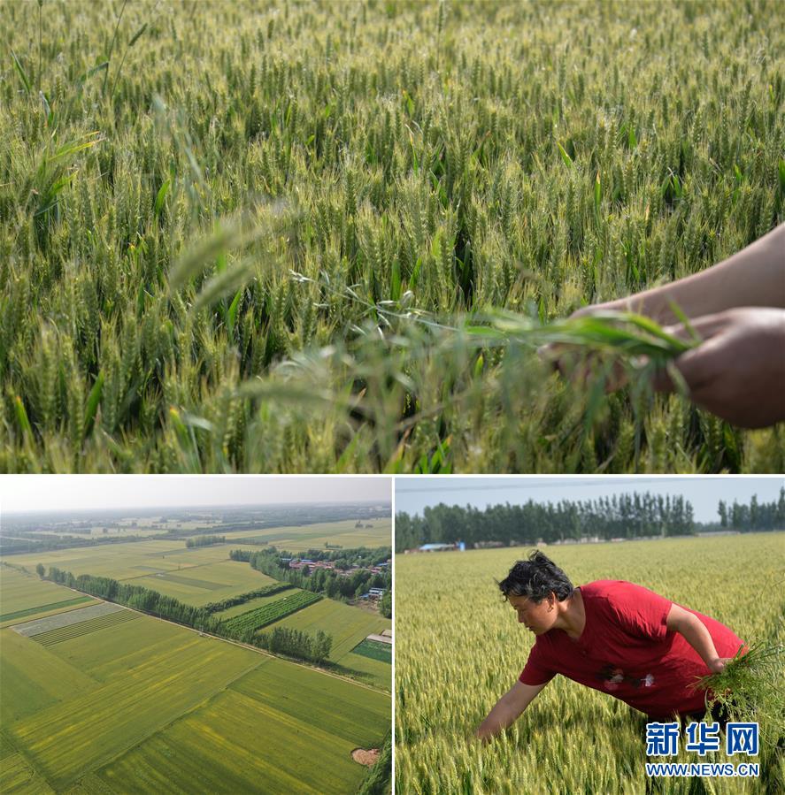 這是一張拼版照片(圖片均為5月16日攝)。上圖、下右圖:在河南省開(kāi)封市尉氏縣十八里鎮(zhèn)趙崗村,村民郭菊在麥田內(nèi)清除雜草。今年她家流轉(zhuǎn)土地種了18畝小麥,長(zhǎng)勢(shì)良好。下左圖:尉氏縣十八里鎮(zhèn)趙崗村附近集中連片的麥田即將迎來(lái)收獲(無(wú)人機(jī)照片)。新華社記者孫清清攝