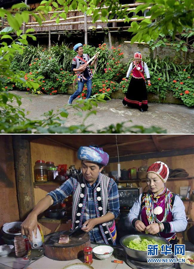 拼版照片上圖:郁伍林和魯冰花在客棧院子里彈唱歌舞(2017年5月27日攝);下圖:郁伍林和魯冰花為客人準(zhǔn)備晚餐(2017年5月26日攝)。云南省怒江傈僳族自治州福貢縣匹河怒族鄉(xiāng)老姆登村的郁伍林和妻子魯冰花,是該村開(kāi)辦農(nóng)家樂(lè)和客棧的致富帶頭人。夫妻倆還創(chuàng)建了茶葉品牌,幫助老姆登村怒族群眾把種植的生態(tài)茶葉銷往國(guó)內(nèi)外。在他們的引導(dǎo)和帶動(dòng)下,山寨的父老鄉(xiāng)親通過(guò)經(jīng)營(yíng)農(nóng)家樂(lè)客棧和種植茶葉逐步脫貧致富,日子越過(guò)越紅火。黨的十八大以來(lái),我們堅(jiān)持以人民為中心的發(fā)展思想,明確了到2020年我國(guó)現(xiàn)行標(biāo)準(zhǔn)下農(nóng)村貧困人口實(shí)現(xiàn)脫貧、貧困縣全部摘帽、解決區(qū)域性整體貧困的目標(biāo)任務(wù)。目前看,脫貧進(jìn)度符合預(yù)期,成就舉世矚目。這些成績(jī)的取得,凝聚了全黨全國(guó)各族人民智慧和心血,是廣大干部群眾扎扎實(shí)實(shí)干出來(lái)的。脫貧摘帽不是終點(diǎn),而是新生活、新奮斗的起點(diǎn)。新華社記者楊宗友攝