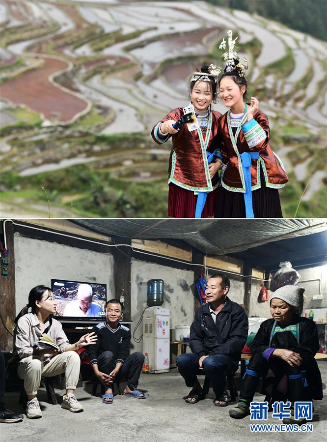 拼版照片上圖:吳賢艷(左)與村里的大一女生梁瓊英在直播推介加榜梯田風(fēng)光(4月19日攝);下圖:吳賢艷(左一)夜訪貧困戶(4月18日攝)。從江縣是貴州省深度貧困縣之一。1994年出生的從江縣侗族女孩吳賢艷在2017年大學(xué)畢業(yè)后回到月亮山區(qū)。2019年3月,她成為從江縣加榜鄉(xiāng)加車村脫貧攻堅(jiān)指揮所的一名網(wǎng)格員。吳賢艷和其他駐村干部不僅會(huì)主動(dòng)幫助缺少勞動(dòng)力的農(nóng)戶,還利用閑暇時(shí)間通過(guò)網(wǎng)絡(luò)平臺(tái),向山外推介美麗的加榜梯田和苗寨風(fēng)光,吸引更多的游客來(lái)旅游,為村民們脫貧增收出謀劃策。黨的十八大以來(lái),我們堅(jiān)持以人民為中心的發(fā)展思想,明確了到2020年我國(guó)現(xiàn)行標(biāo)準(zhǔn)下農(nóng)村貧困人口實(shí)現(xiàn)脫貧、貧困縣全部摘帽、解決區(qū)域性整體貧困的目標(biāo)任務(wù)。目前看,脫貧進(jìn)度符合預(yù)期,成就舉世矚目。這些成績(jī)的取得,凝聚了全黨全國(guó)各族人民智慧和心血,是廣大干部群眾扎扎實(shí)實(shí)干出來(lái)的。脫貧摘帽不是終點(diǎn),而是新生活、新奮斗的起點(diǎn)。新華社記者楊文斌攝