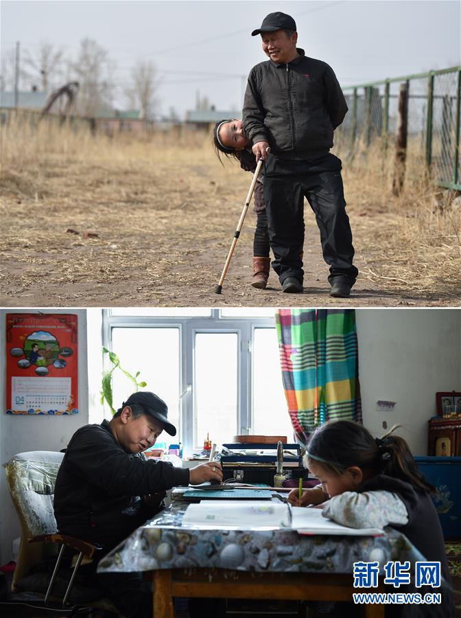 拼版照片上圖:在錫尼河鎮(zhèn)的出租房外,米格木爾(前)和女兒南吉樂(lè)瑪一起玩耍;下圖:在錫尼河鎮(zhèn)的出租房?jī)?nèi),米格木爾在進(jìn)行皮雕,女兒南吉樂(lè)瑪在溫習(xí)功課(照片均攝于4月15日)。2016年,家住內(nèi)蒙古鄂溫克族自治旗錫尼河鎮(zhèn)孟根礎(chǔ)魯嘎查的米格木爾因?yàn)槿笔趧?dòng)能力成了建檔立卡貧困戶。獨(dú)自撫養(yǎng)女兒的他為了女兒上學(xué)離開(kāi)了牧區(qū)來(lái)到鎮(zhèn)上租房陪讀,生活的壓力讓米格木爾犯了難。2018年春天,他通過(guò)當(dāng)?shù)孛褡逦幕a(chǎn)業(yè)創(chuàng)業(yè)園舉辦的皮雕手藝培訓(xùn),讓他居家賺錢、陪讀兩不誤,逐步實(shí)現(xiàn)穩(wěn)定脫貧。2020年4月,我國(guó)第一個(gè)成立的少數(shù)民族自治區(qū)——內(nèi)蒙古自治區(qū)宣告全面脫貧“摘帽”。黨的十八大以來(lái),我們堅(jiān)持以人民為中心的發(fā)展思想,明確了到2020年我國(guó)現(xiàn)行標(biāo)準(zhǔn)下農(nóng)村貧困人口實(shí)現(xiàn)脫貧、貧困縣全部摘帽、解決區(qū)域性整體貧困的目標(biāo)任務(wù)。目前看,脫貧進(jìn)度符合預(yù)期,成就舉世矚目。這些成績(jī)的取得,凝聚了全黨全國(guó)各族人民智慧和心血,是廣大干部群眾扎扎實(shí)實(shí)干出來(lái)的。脫貧摘帽不是終點(diǎn),而是新生活、新奮斗的起點(diǎn)。新華社記者劉磊攝