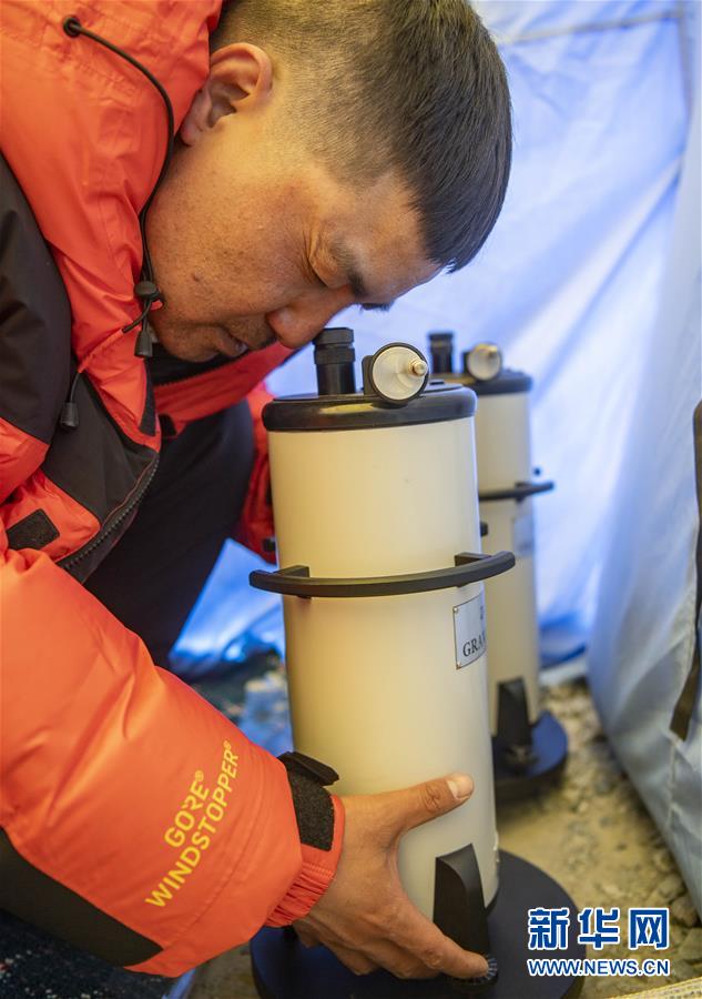 國(guó)測(cè)一大隊(duì)隊(duì)員在珠峰大本營(yíng)測(cè)試地面測(cè)量中使用的重力儀(5月3日攝)。新華社記者晉美多吉攝