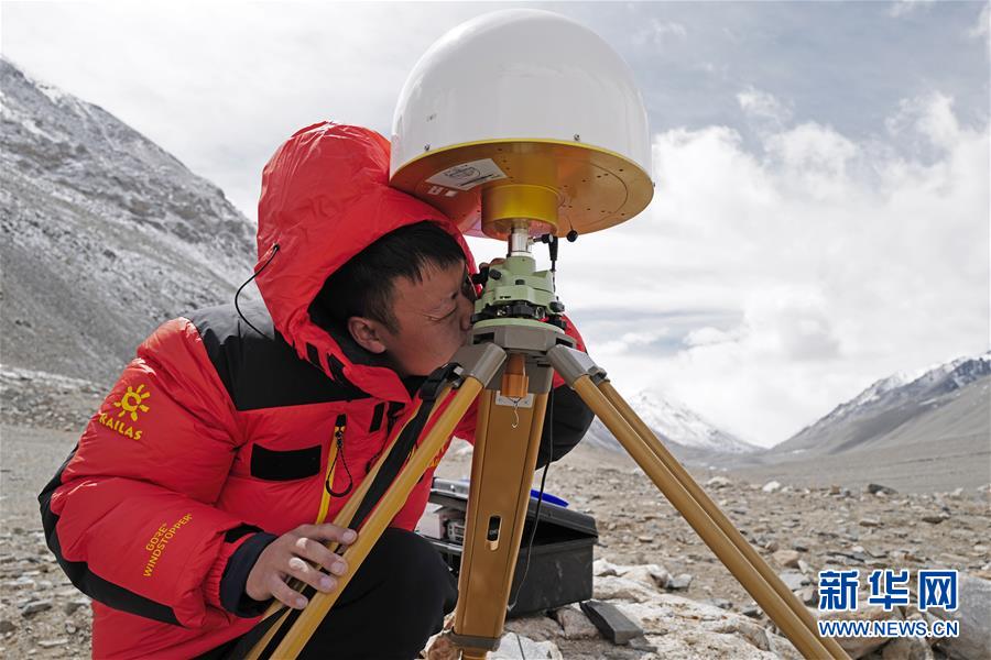 國(guó)測(cè)一大隊(duì)隊(duì)員在珠峰大本營(yíng)附近測(cè)試設(shè)備(5月17日攝)。新華社記者普布扎西攝
