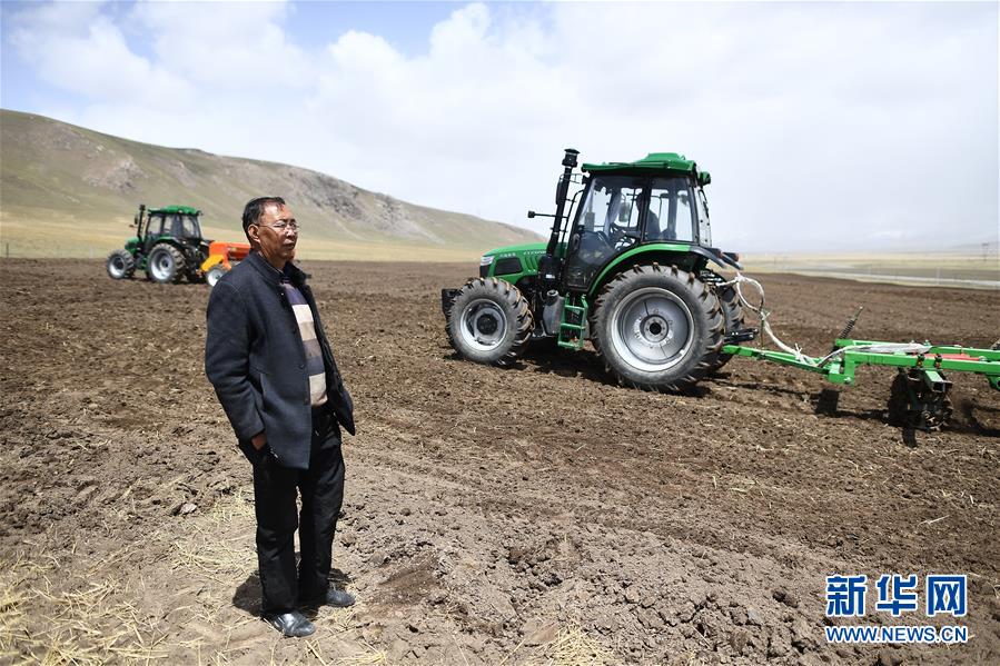 在青海省海北藏族自治州海晏縣青海湖鄉(xiāng)同寶村,者成倉(cāng)在地里查看播種進(jìn)度(5月13日攝)。新華社記者張宏祥攝
