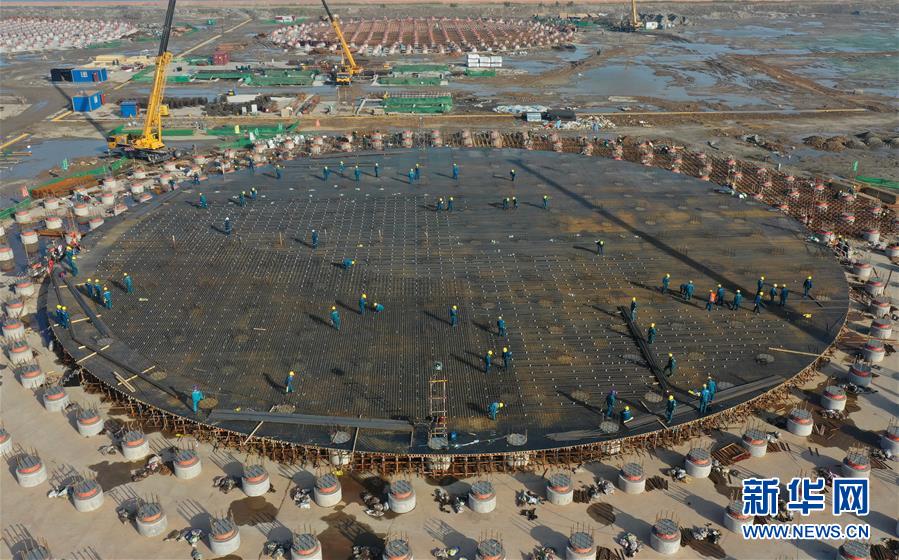 5月23日,工人在唐山市曹妃甸區(qū)LNG項(xiàng)目第一階段工程儲(chǔ)罐建設(shè)工地施工(無(wú)人機(jī)照片)。