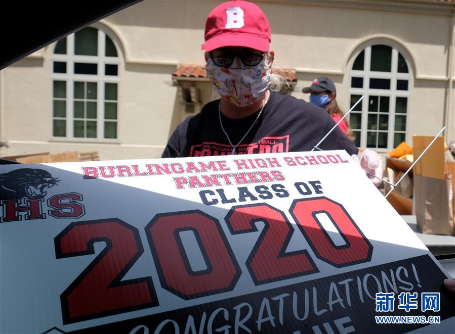 5月22日,在美國加州北部圣馬特奧縣,工作人員歡迎來辦理畢業(yè)手續(xù)的學(xué)生。新華社記者吳曉凌攝