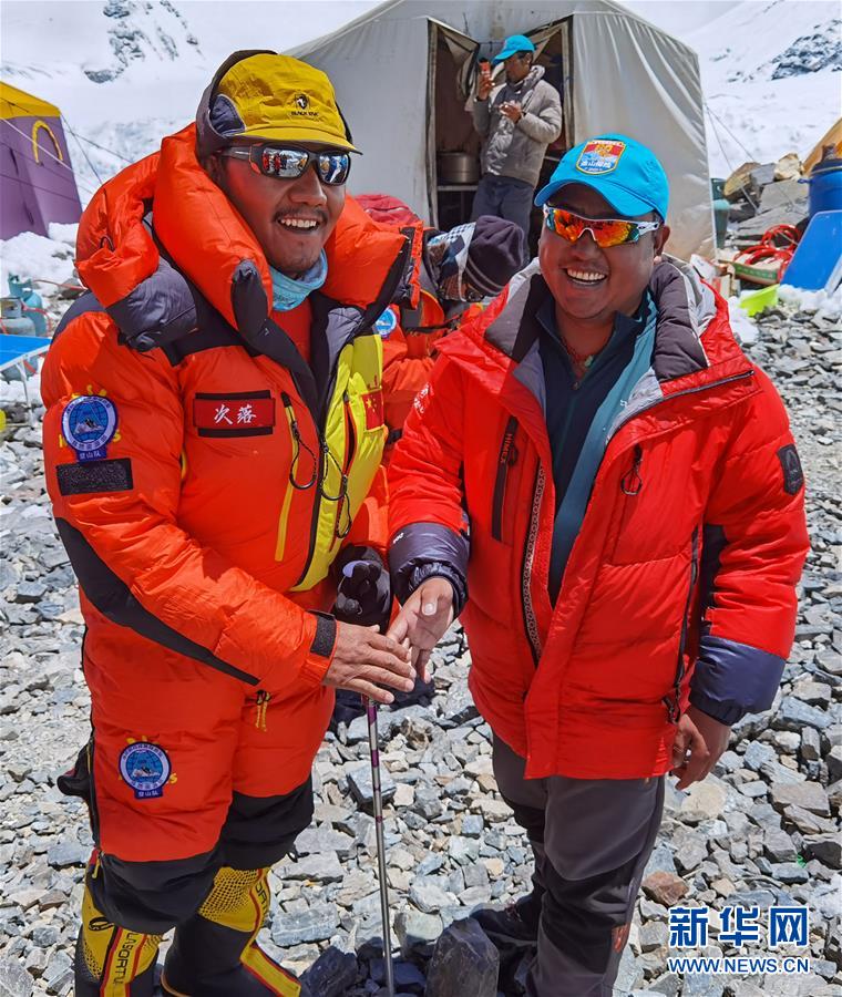 5月24日,2020珠峰高程測量登山隊副隊長桑珠(右)和沖頂組組長次落(左)在海拔6500米的前進營地。新華社特約記者拉巴攝