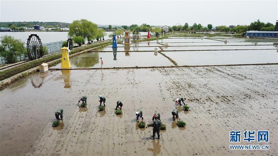 這是5月22日拍攝的農(nóng)民在寧安市渤海鎮(zhèn)上官地村一塊稻田中插秧(無人機照片)。新華社記者王建威攝